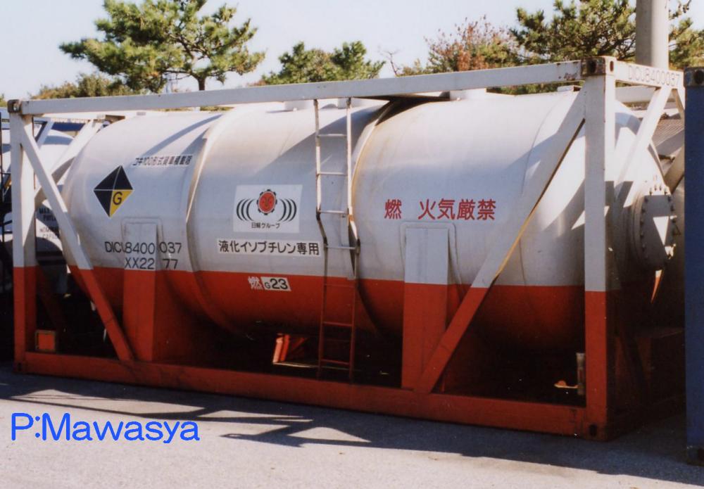 液化イソブチレン専用のコンテナ。形式を持つ私有コンテナにも似た形のコンテナがありますが、化成品分類番号が燃G23からわかる通り、ガス類は色分けの対象外なのでしょうか。ハローマークが付くなど珍しいコンテナですが、国籍コードがあり、これが非常に珍しいもので、JXX2277というもの。日本を意味するのですが、登場した頃は「JP」となるはずですが、初期の「JXX」で登録されています。
