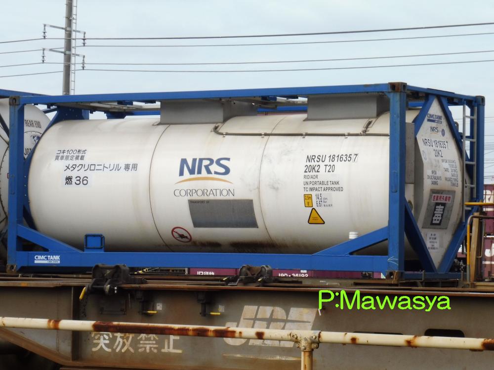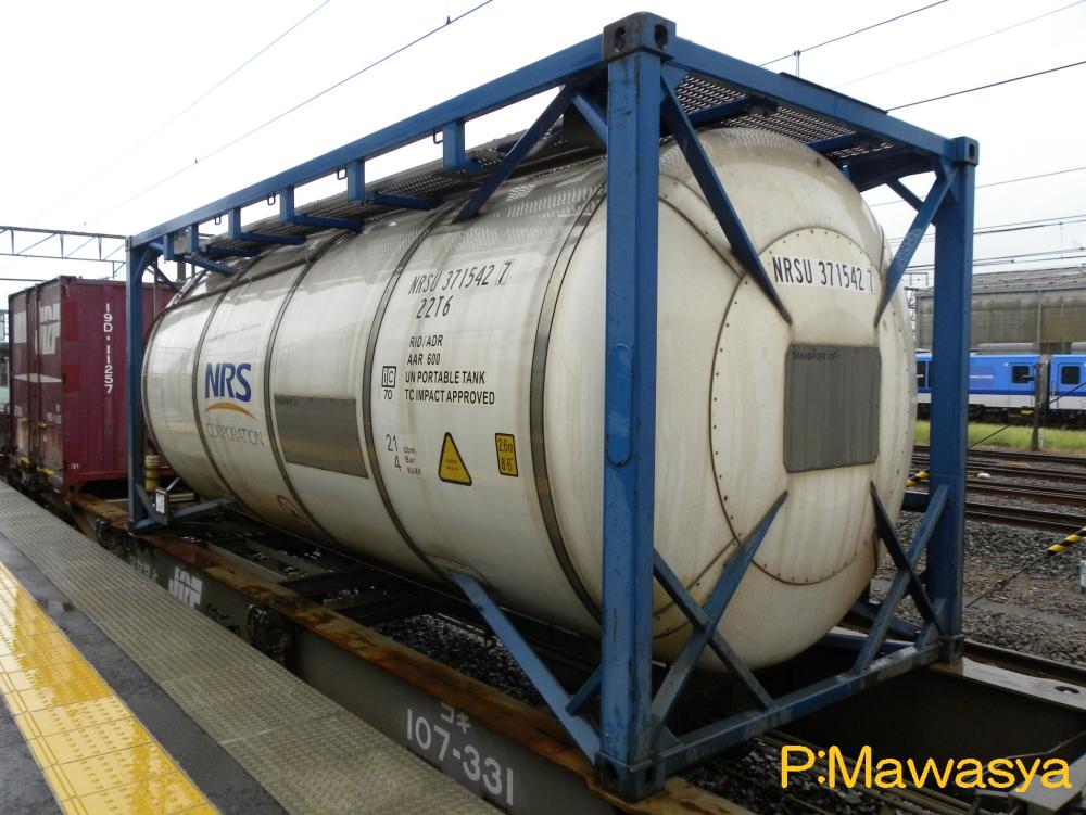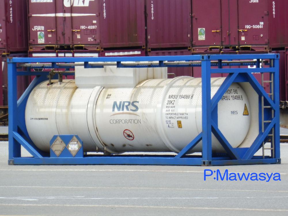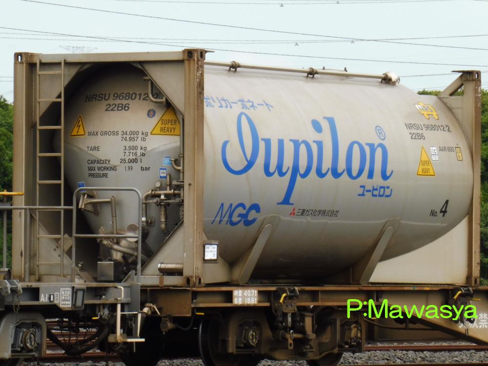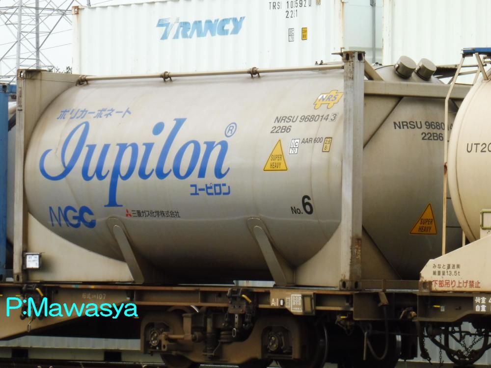 ポリカーボネート専用のコンテナ。三菱ガス化学(株)がリースしている個体です。登場時には大きく商品名が書かれていましたが、現在は消されています。涙目型の特殊なタンク体となっていますが、キセ付きなので外からは見ることが出来ません。仕様コード(ISO6346)は22B6(20ftコンテナで、高さ2591mm(22)のバルク又はホッパコンテナ)となっています。