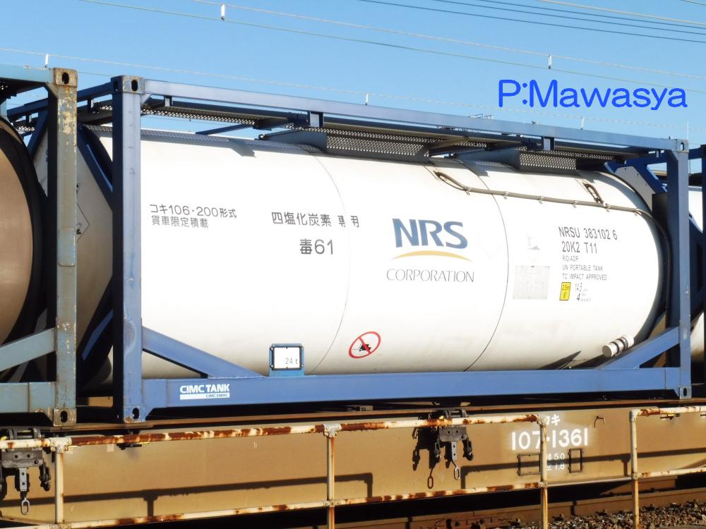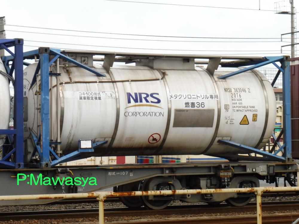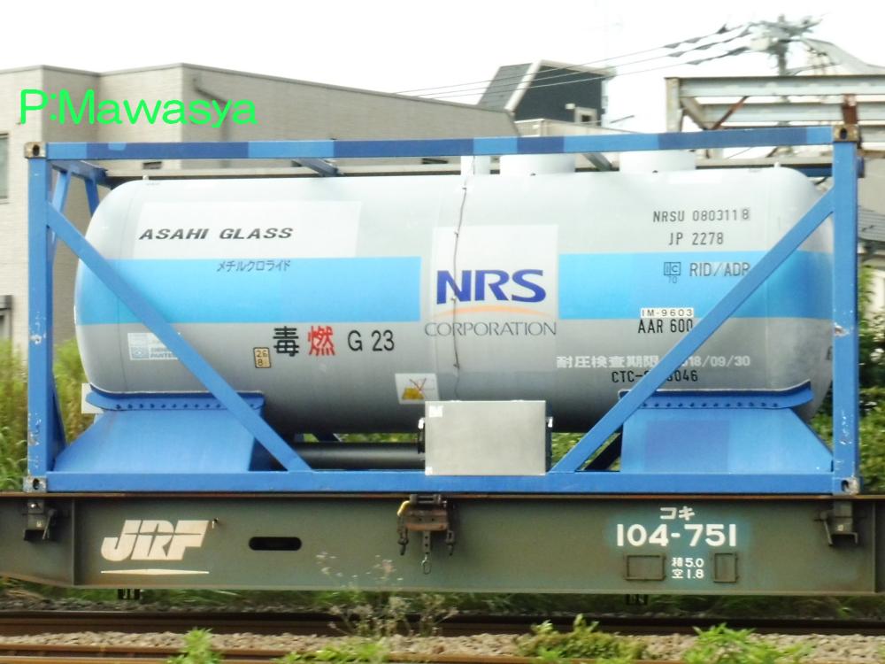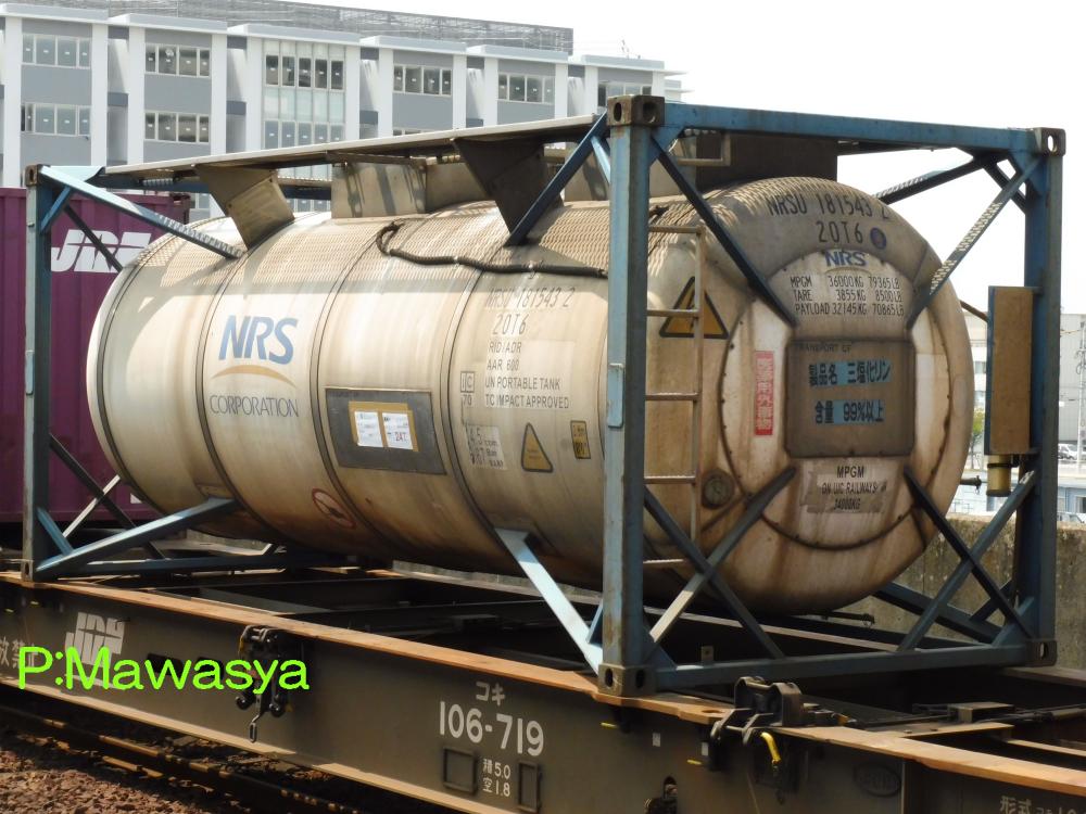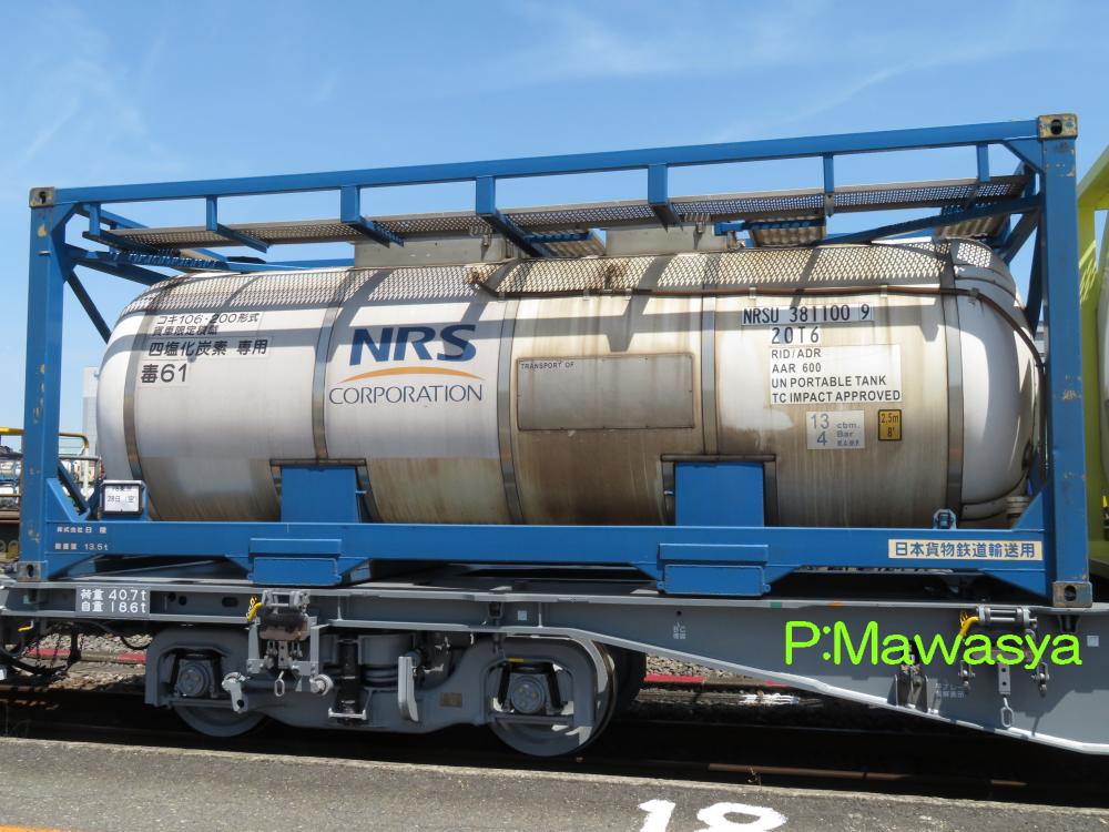 ポリカーボネート専用のコンテナ。三菱ガス化学(株)がリースしている個体です。登場時には大きく商品名が書かれていましたが、現在は消されています。涙目型の特殊なタンク体となっていますが、キセ付きなので外からは見ることが出来ません。仕様コード(ISO6346)は22B6(20ftコンテナで、高さ2591mm(22)のバルク又はホッパコンテナ)となっています。