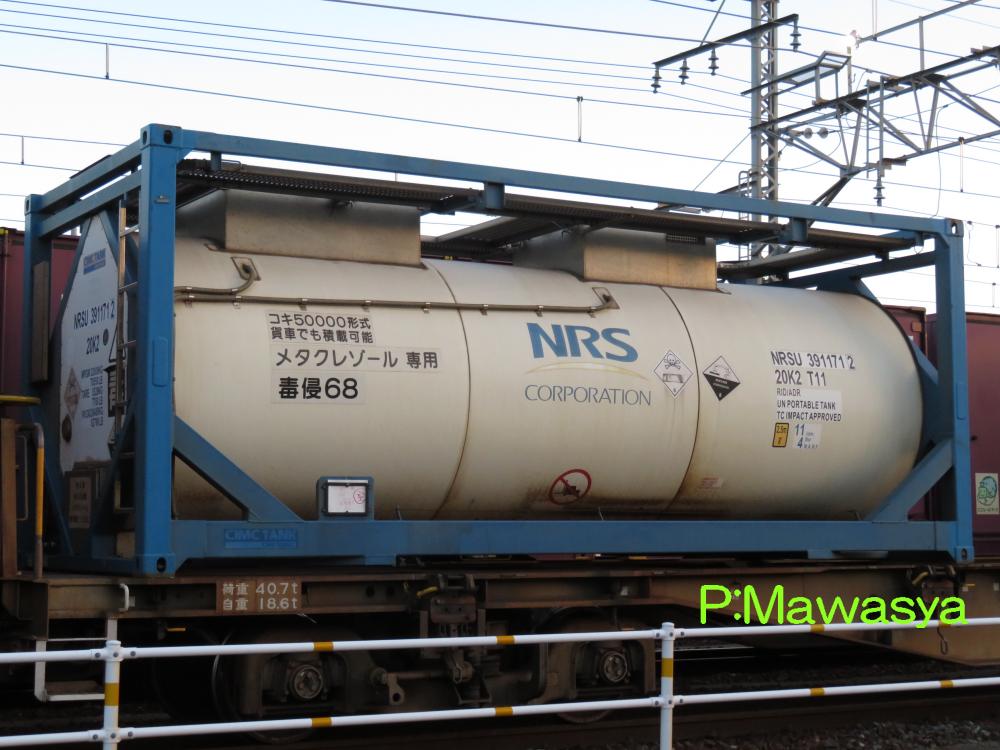 メタクレゾール専用のコンテナ。「コキ50000形式貨車でも積載可能」の非常に珍しい表記があるのが特徴です。化成品分類番号は毒侵68。仕様コード(ISO6346)は20K2となっています。