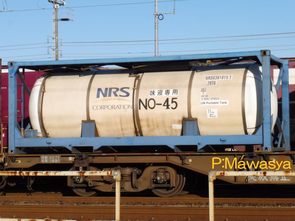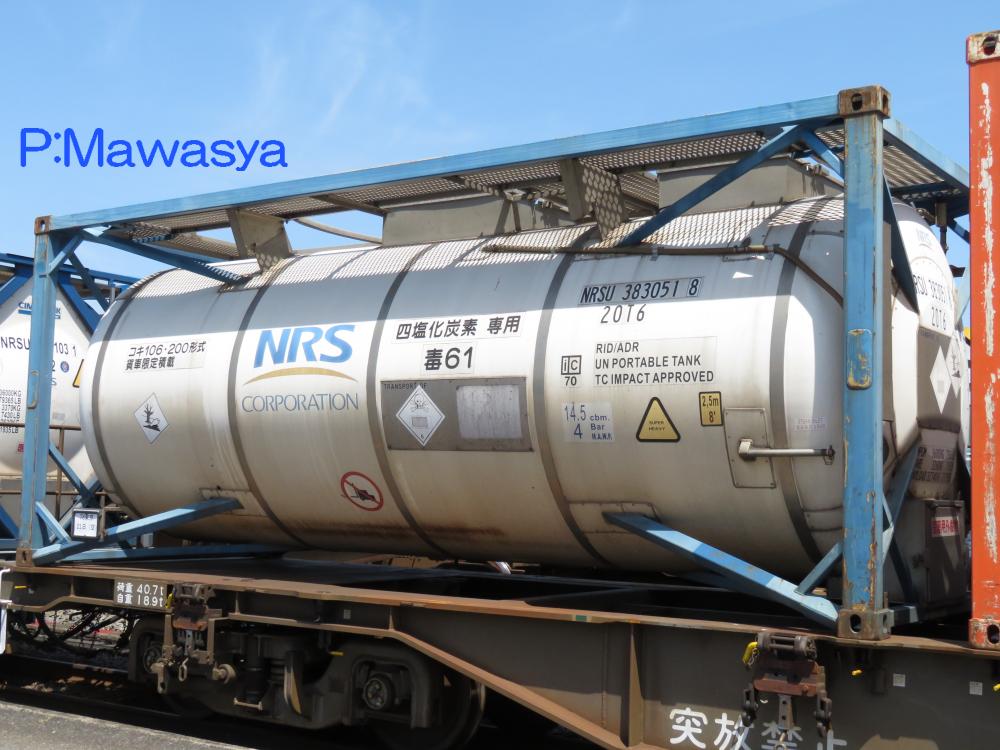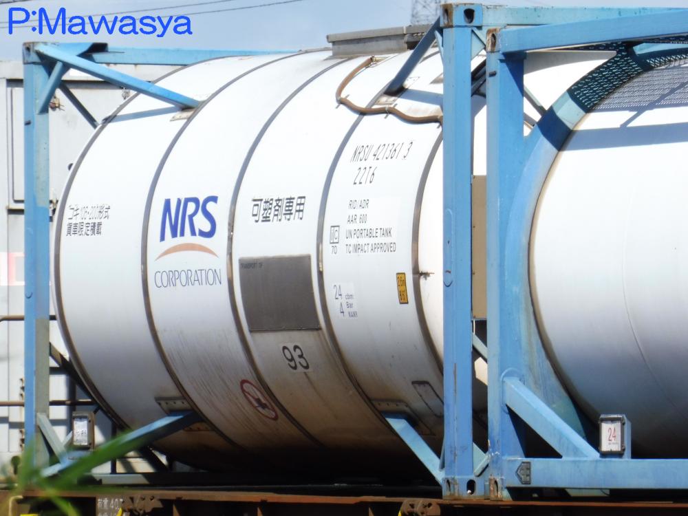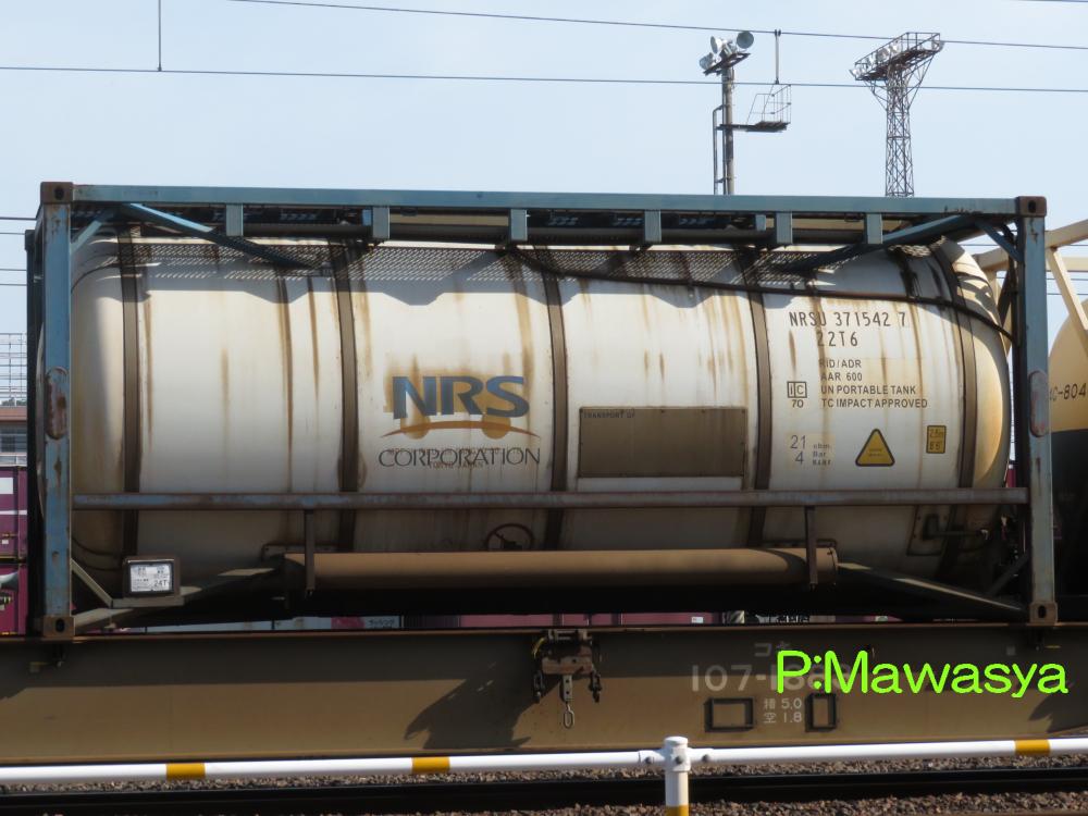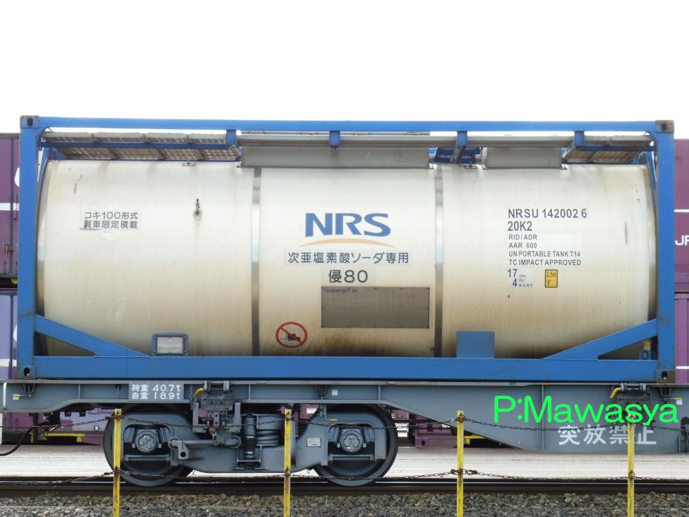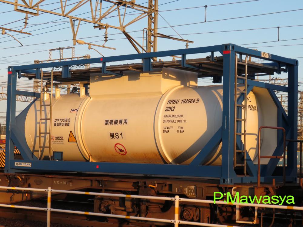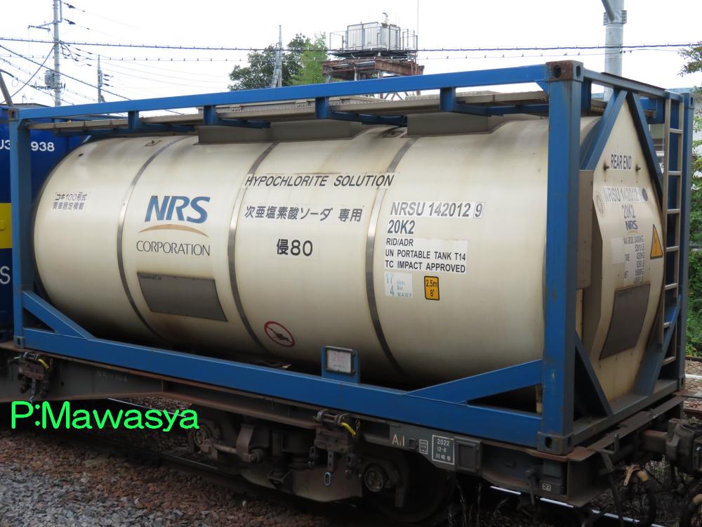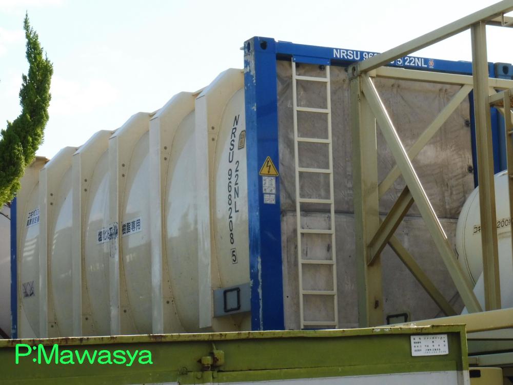水硫化ソーダ専用のコンテナ。(荷票に表示されていました。)この2枚は同じ個体で、片方は上部に梁がありますが、ホース収納箱がある反対側は梁が2本となっています。仕様コード(ISO6346)は22T6となっています。