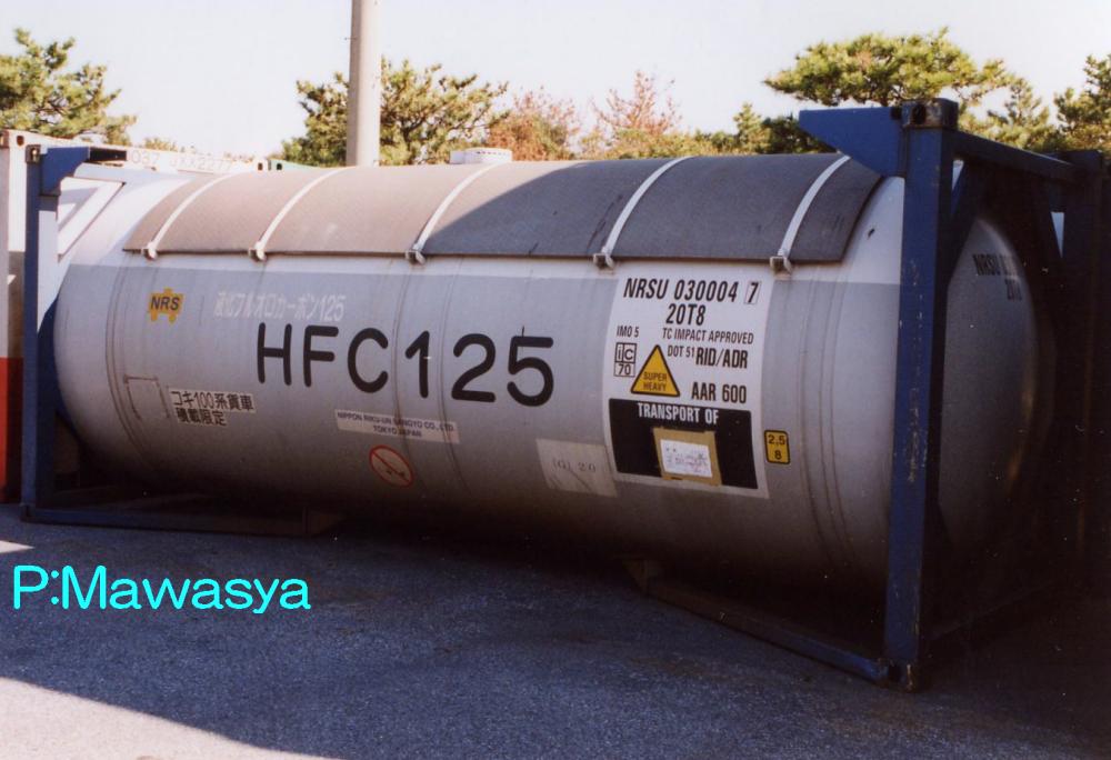 液化フルオロカーボン125専用のコンテナ。高圧ガスタンクコンテナに採用されているフレームになっています。化成品分類番号はG(20)。仕様コード(ISO6346)は22T8となっています。