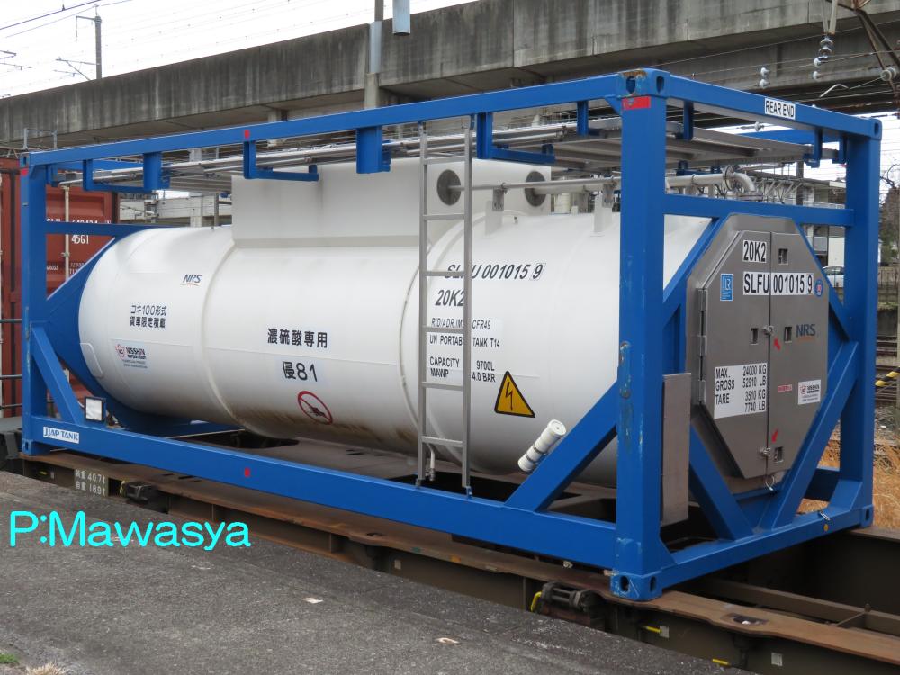 濃硫酸専用のコンテナ。非常に危険な化学物質なので、はしごの数など独特のスタイルとなっています。化成品分類番号は侵81。仕様コード(ISO6346)は20K2となっています。