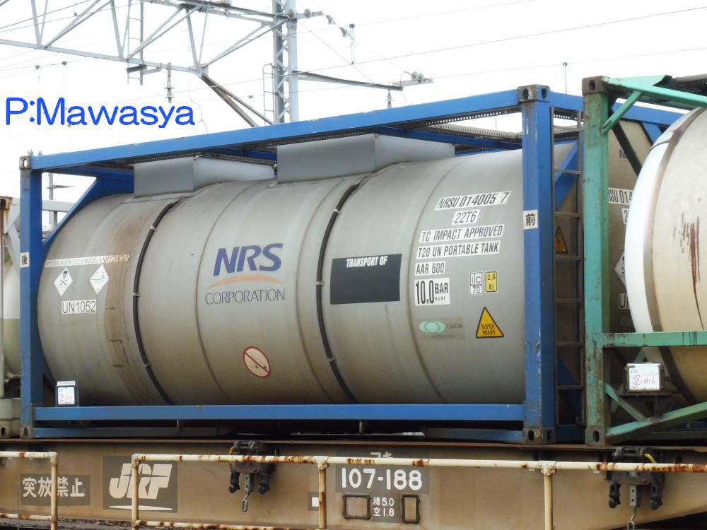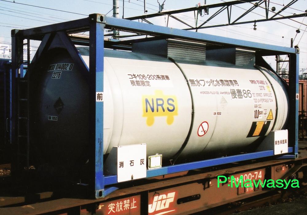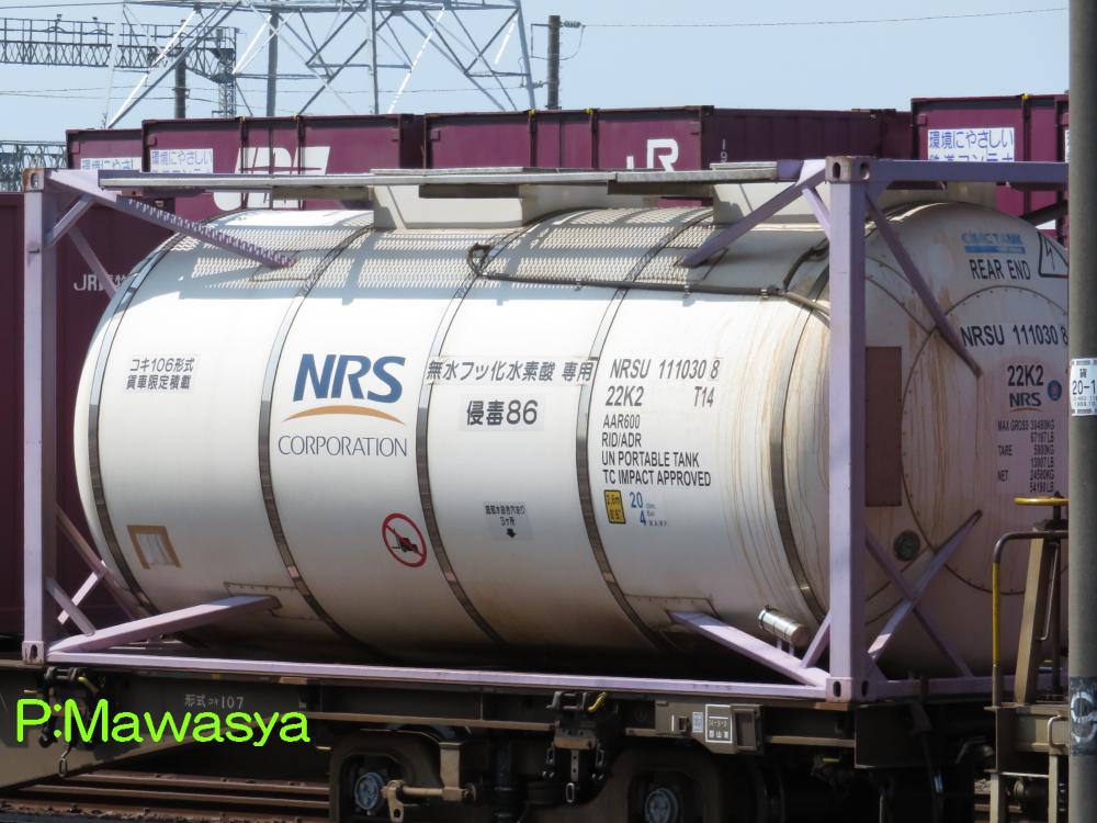 無水フッ化水素酸専用コンテナのビームタイプの個体。日本陸運産業のコンテナと言えば青色のフレームなのに、これは紫色。という事は、日本石油輸送所属の個体の転籍なのでしょうか?紫色はローハイト11kLタイプなのですが。この世界は奥が深いのです。化成品分類番号は侵毒86。仕様コード(ISO6346)は22K2です。