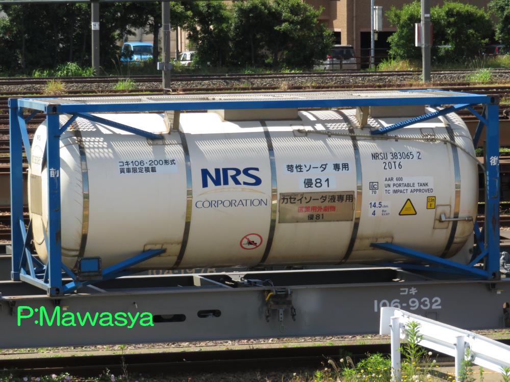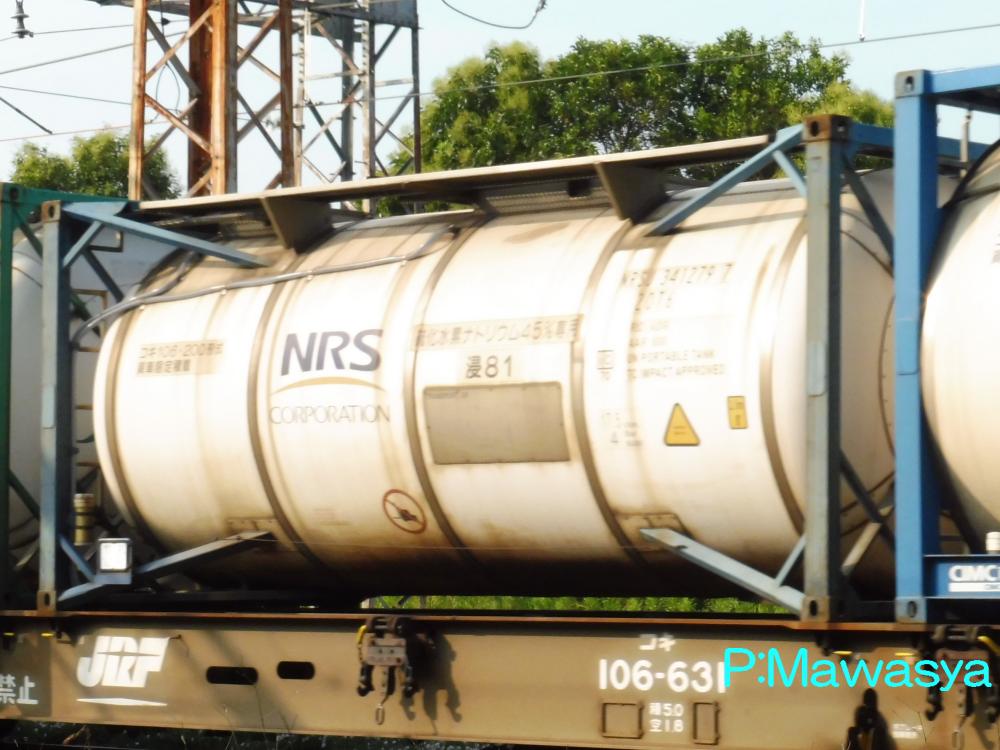 苛性ソーダ液専用のコンテナ。上部に横梁がある日陸標準のフレビータイプコンテナです。化成品分類番号は侵81。仕様コード(ISO6346)は20Т6です。