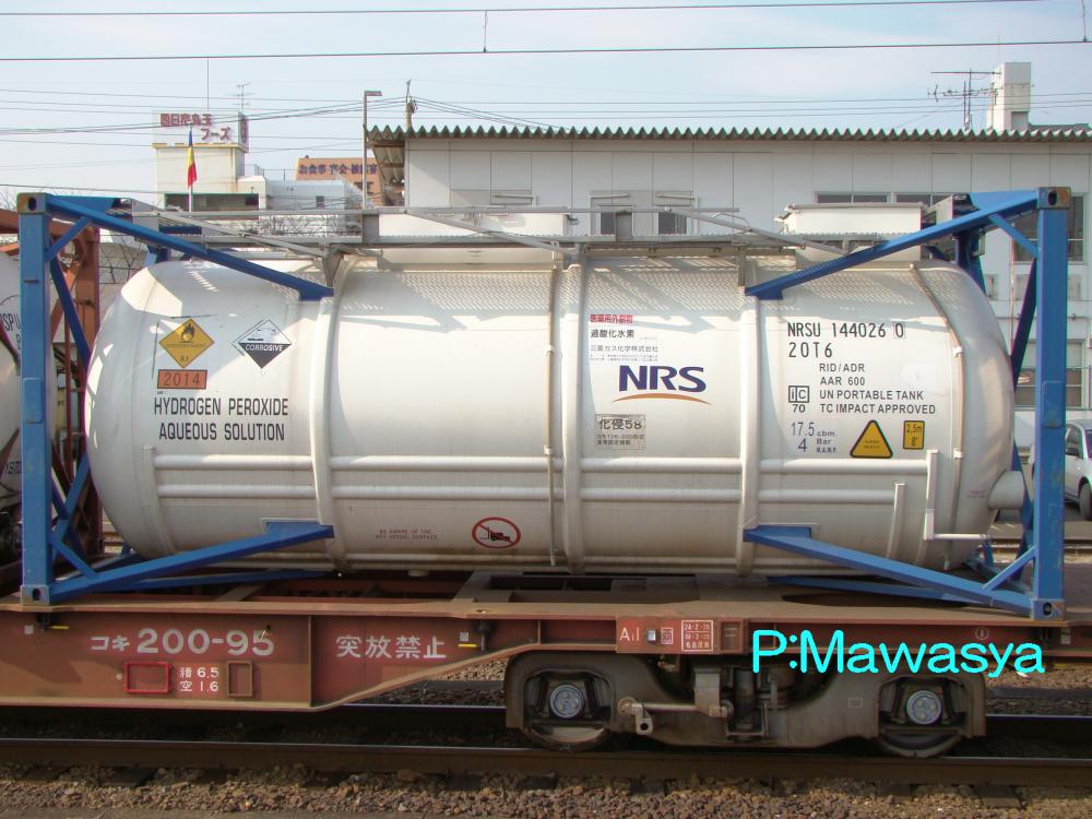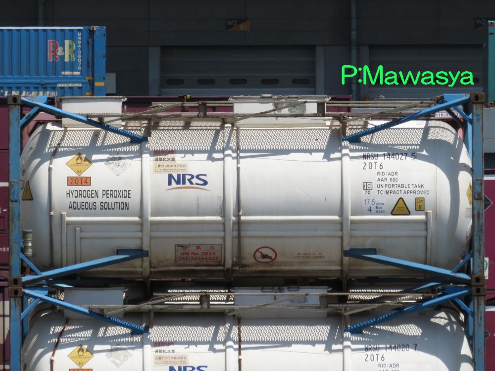 過酸化水素専用のコンテナ。特徴はタンク体で、しっかりとした補強梁があります。結構な危険物なので、英語で向かって左側に過酸化水素と書かれています。化成品分類番号は化侵58。仕様コード(ISO6346)は20Т6です。