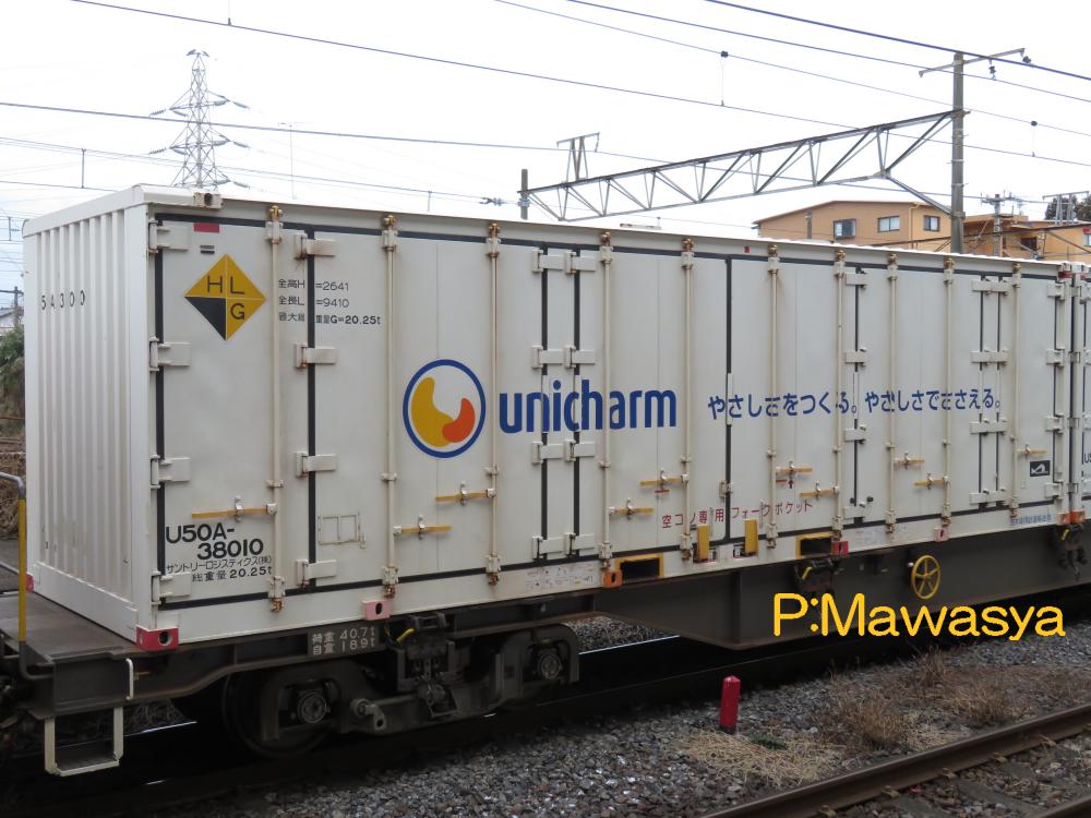 トラックからのモーダルシフトにより登場しました。静岡県の工場から福岡県の部品センターへ製品を運んでいます。当初は左の38131番のみでしたが、増備が行われています。増備された固体の妻扉は青色となっています。