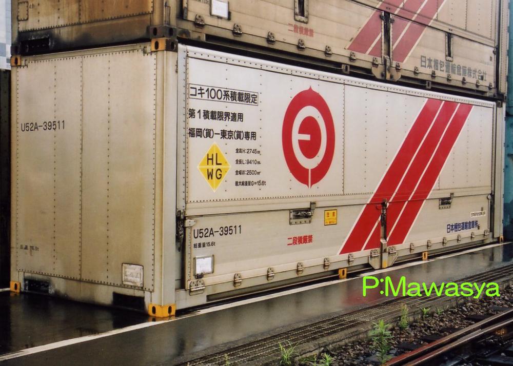 日本通運の「エコライナー」シリーズのコンテナ。39521~39565は「BIG ECO LINER31」と表記されています。「コキ100系積載限定」から初期のグループであることがわかります。U50A形式よりも背高のコンテナで、軽量嵩高貨物を輸送しています。荷重は8.4t、総重量は15tですが、ハローマークにGを標記したものとそうでないものがあります。