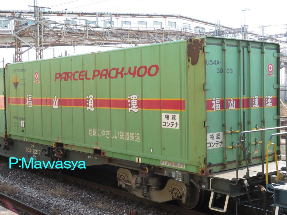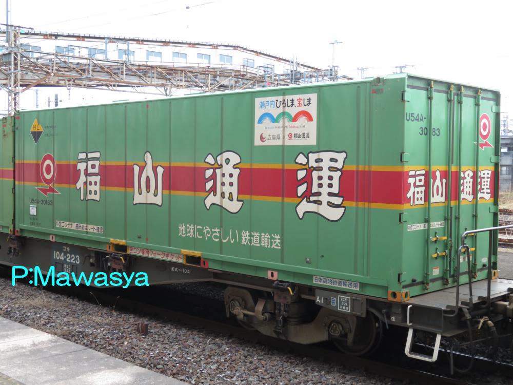 「福山レールエクスプレス」用コンテナとして、30148~30277の130個が製造されました。「特認コンテナ 高床車はルート確認」というステッカーが貼られています。